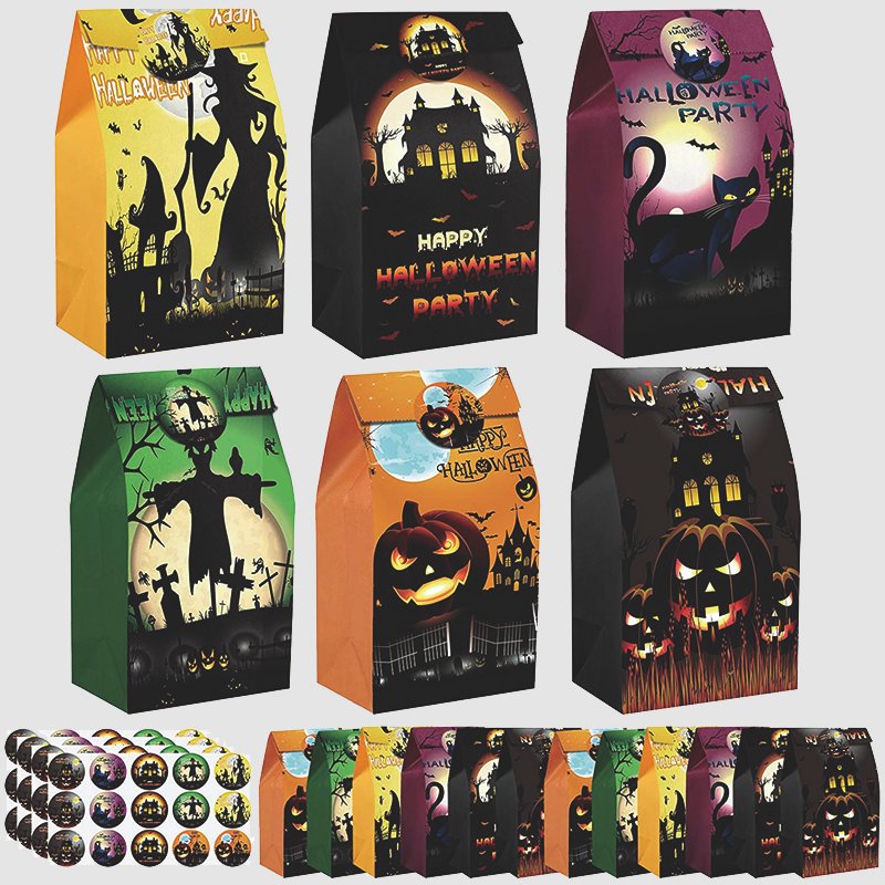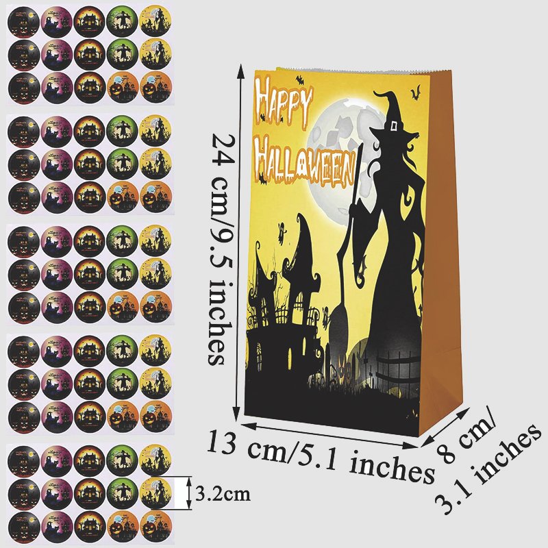 One pack has 50 bags and 50 matching sticker,with different pattern like pumpkin,cats,bats